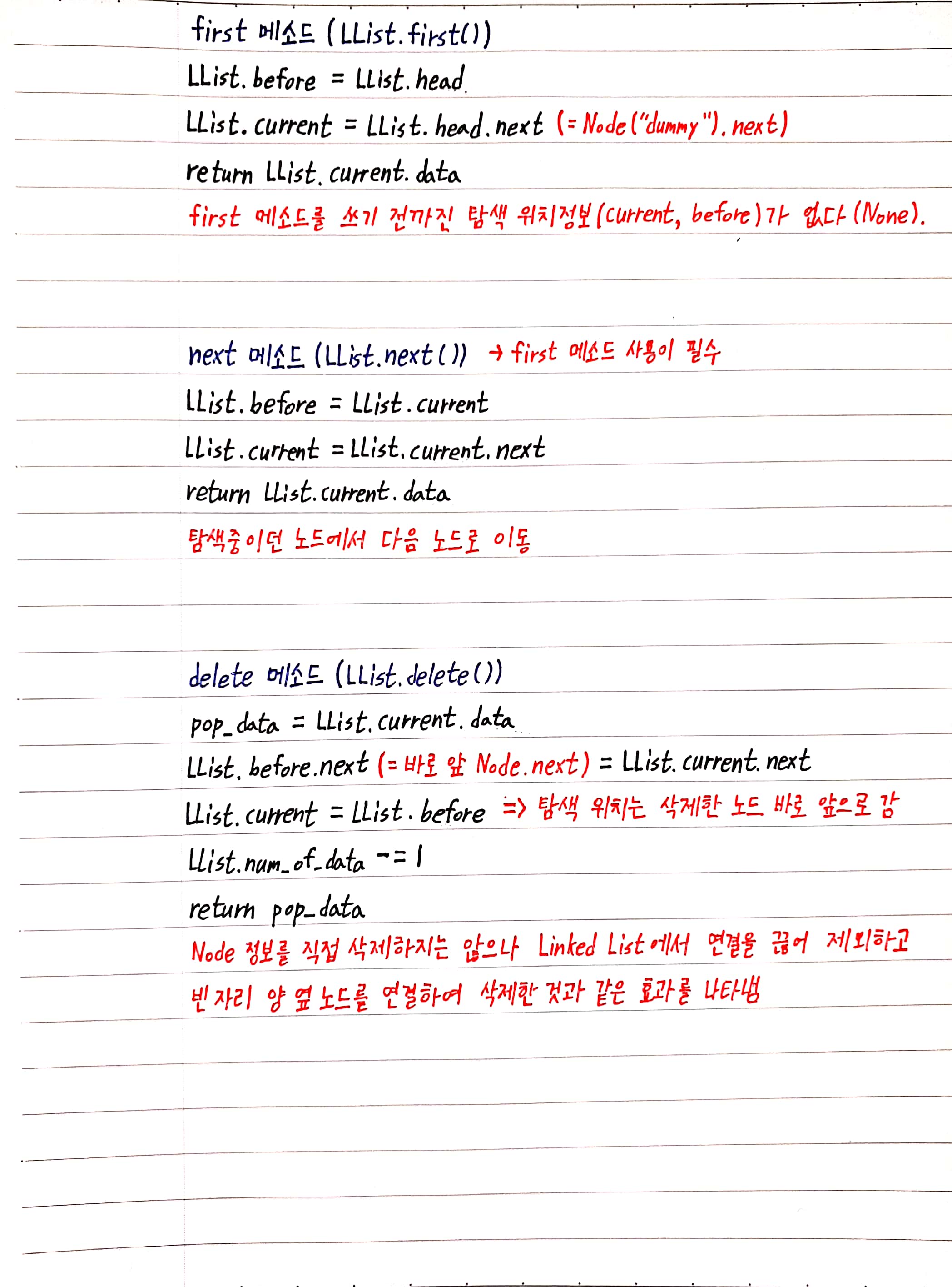 # delete 메소드 (delete - current 노드 삭제, 인접 노드의 current, next 변경, 데이터 개수 변경)